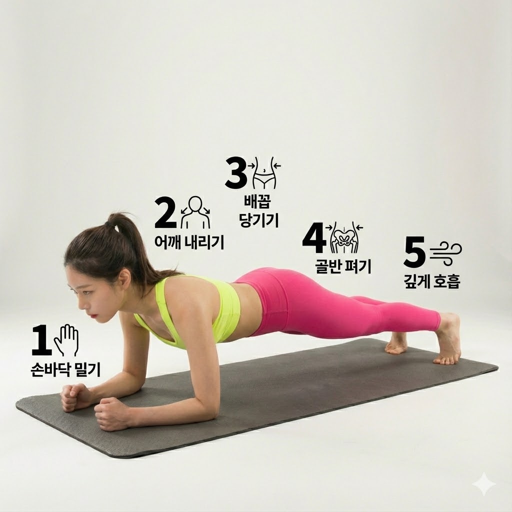 특히 6번(호흡)은 정말 중요해요. 숨이 멈춘다는 건 “내가 지금 과하게 힘을 주고 있다”는 신호입니다. 플랭크는 힘을 ‘많이’ 주는 게 아니라 필요한 곳에만 정확히 주는 운동이에요.