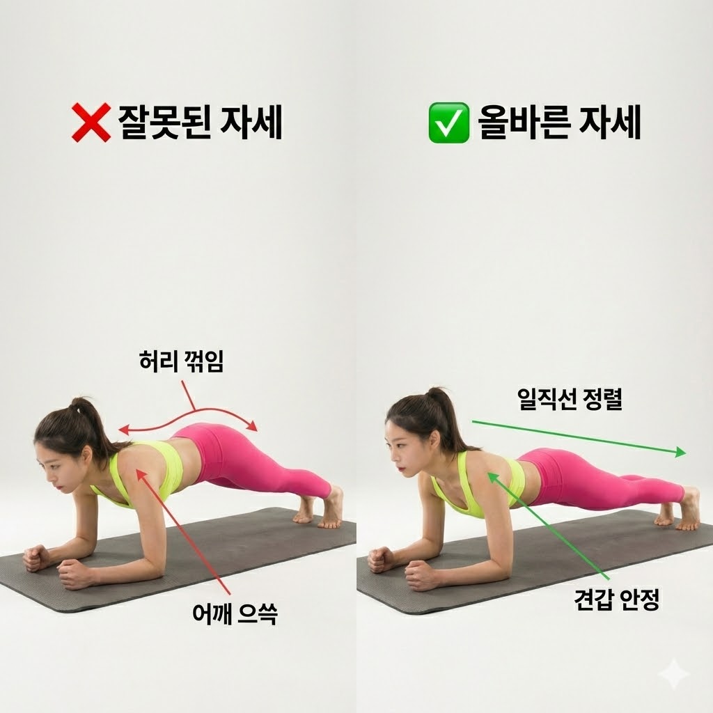 플랭크는 정직합니다. 배가 아니라 다른 데가 먼저 아프다면, 그건 “내가 지금 코어가 아니라 다른 곳으로 버티고 있다”는 뜻이에요. 아래 실수들을 체크하면서 하나씩 고쳐볼게요.