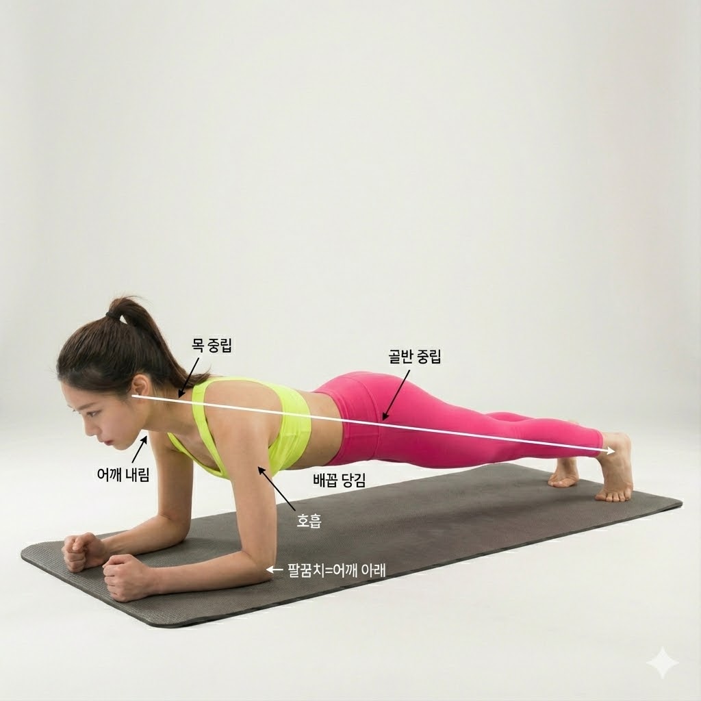 초보자가 플랭크를 망치는 가장 흔한 이유는 “자세를 만든 다음 버틴다”가 아니라 “버티면서 자세를 만들려고” 하기 때문이에요. 그래서 오늘은 순서를 고정합니다.